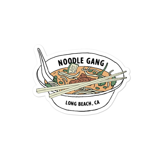 Biking down the beach, warm ocean breeze in your face, belly full of noodles. That's what Noodle Gang Long Beach is about... all vibes. These stickers are printed on durable, high opacity adhesive vinyl which makes them perfect for regular use, as well as for covering other stickers or paint. The high-quality vinyl ensures there are no bubbles when applying the stickers.